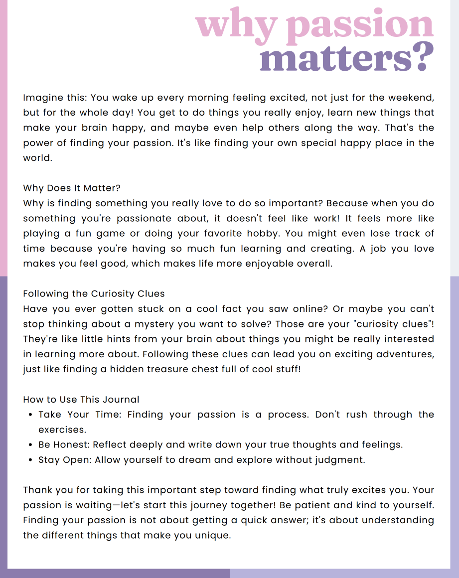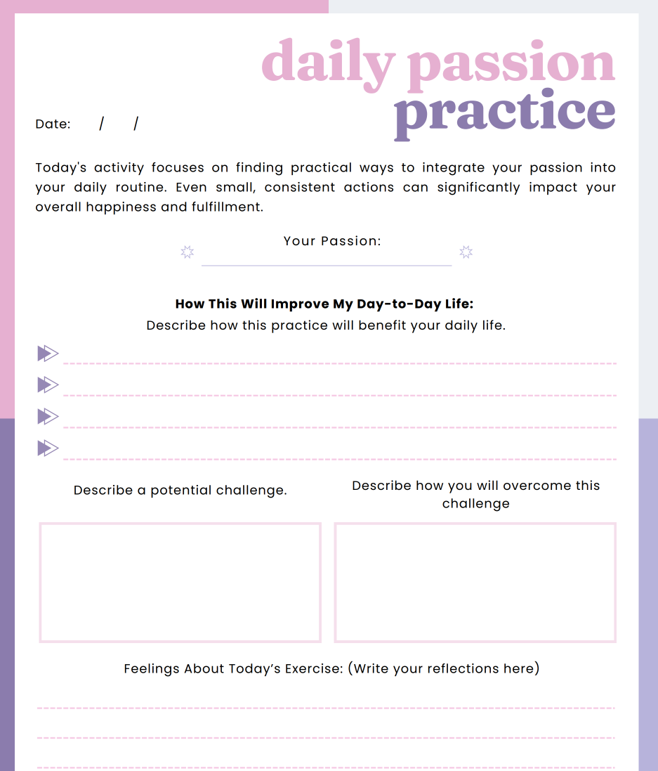 • Action Planning – Step-by-step guides for weaving passion into your daily life and building toward long-term goals.