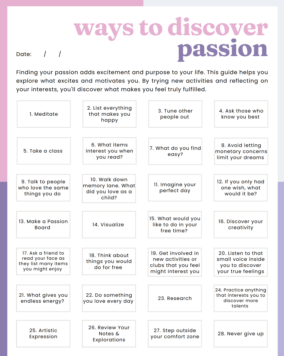 The Find Your Passion Workbook is a guided digital resource designed to help you uncover your unique interests, hidden talents, and life purpose. With a blend of thoughtful prompts, interactive exercises, and reflective activities, this workbook leads you on a journey of self-discovery to identify what brings you energy, joy, and fulfillment.