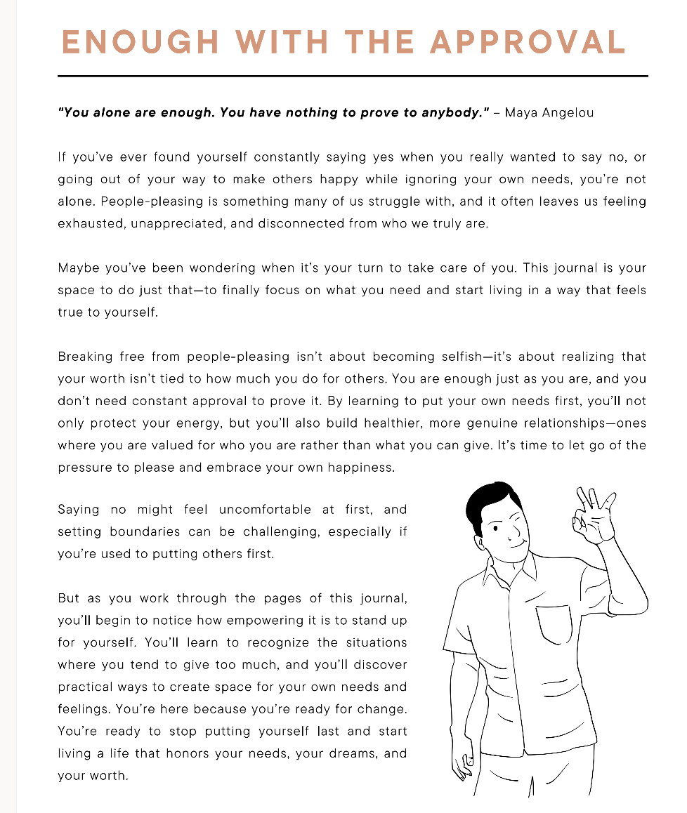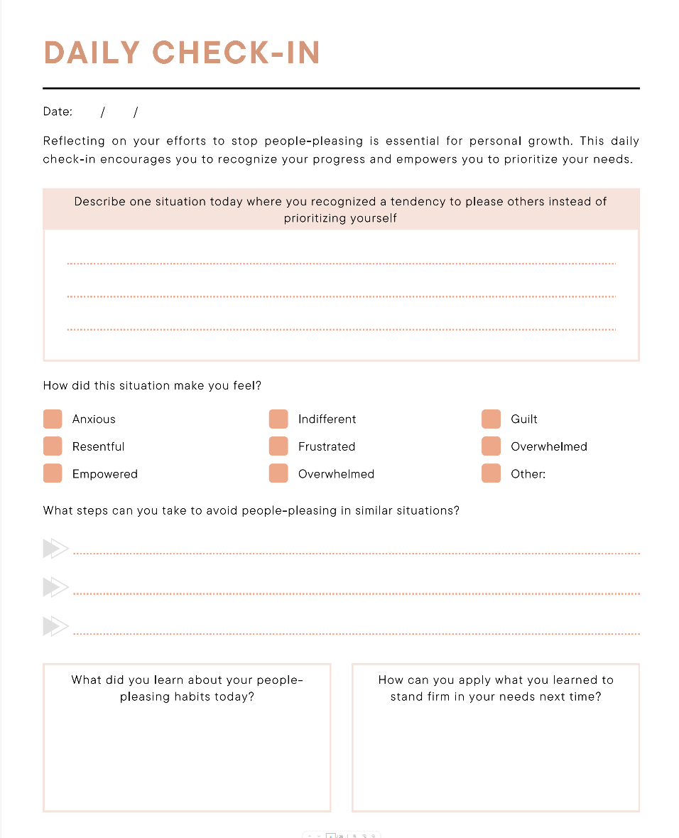 • Self-Reflection & Awareness – Identify your people-pleasing patterns, triggers, and root causes through guided questions and journaling.